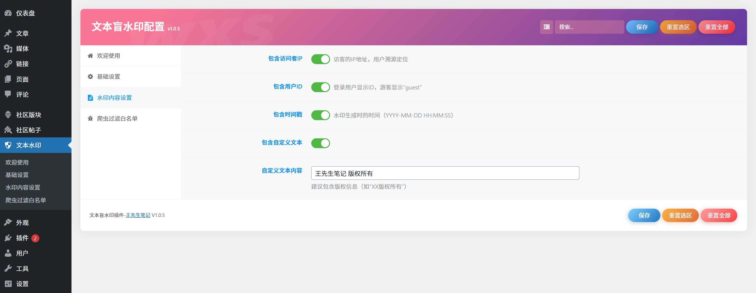 — 便捷的调试与管理:调试模式(显示可见水印为[水印调试:…])、直观的配置面板(通过WordPress后台”文本水印”菜单)、数据清理(卸载时自动清除配置)。