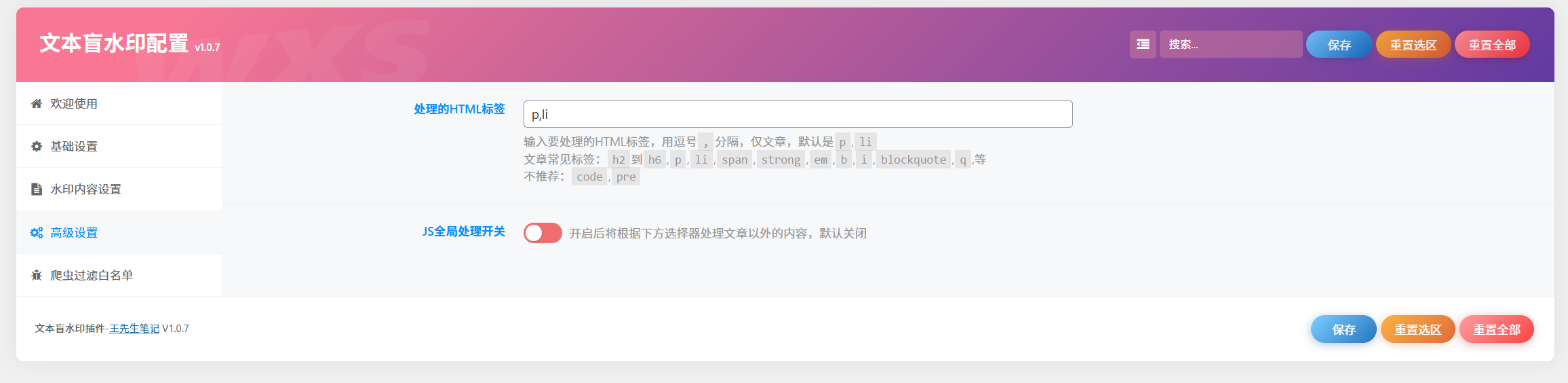 — 智能适应机制:短段落过滤(可配置最小字数,默认20)、爬虫识别(不对搜索引擎爬虫插入水印,避免SEO影响)、双端处理模式(动态纯PHP处理适合非缓存场景、静态纯JS处理适合缓存页面、混合模式推荐用于缓存站点)。