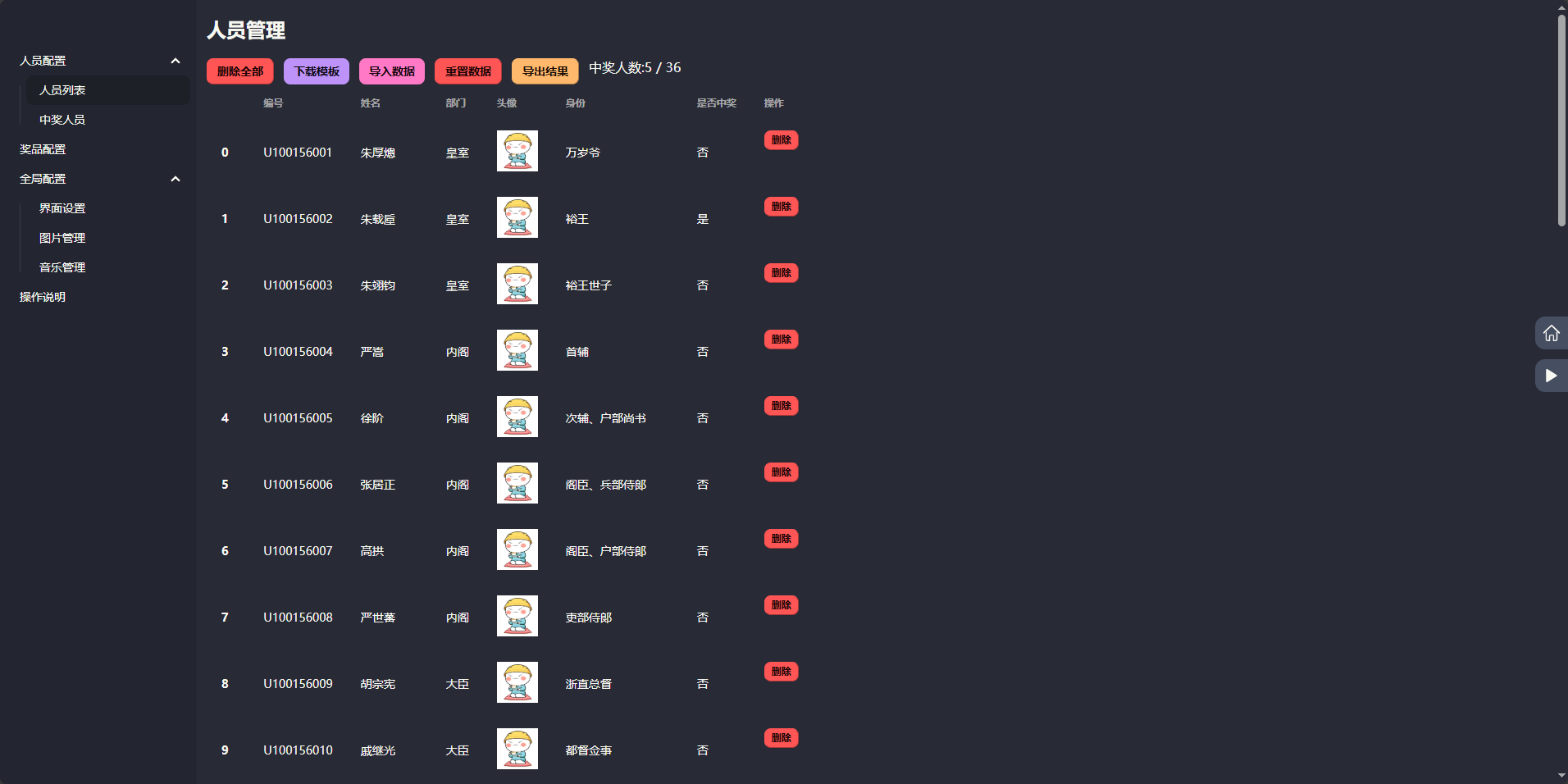 宸玚 2025年12月18日 字数:57,阅读约1分钟 全屏显示 炫酷3D球体年会活动抽奖源码 分类: 精品源码 浏览: 389 发布: 2025年12月18日 更新: 2025年12月18日 免费资源,请尊重版权所有。 请先登录 简介 一个可配置可定制化的抽奖应用,炫酷3D球体,可用于年会抽奖等活动,支持奖品、人员、界面、图片音乐配置。 图片展示 年会活动 抽奖源码 本文作者:宸玚本文链接: https://www.chario.cn/post-57.html 版权声明:本博客所有文章除特别声明外,均默认采用 CC BY-NC-SA 4.0 许可协议。 文章很赞!支持一下吧 还没有人为TA充电 为TA充电 还没有人为TA充电 1320炫酷3D球体年会活动抽奖源码海报分享QQ分享QQ空间微博分享复制链接 支付宝扫一扫 微信扫一扫 感谢支持 文章很赞!支持一下吧