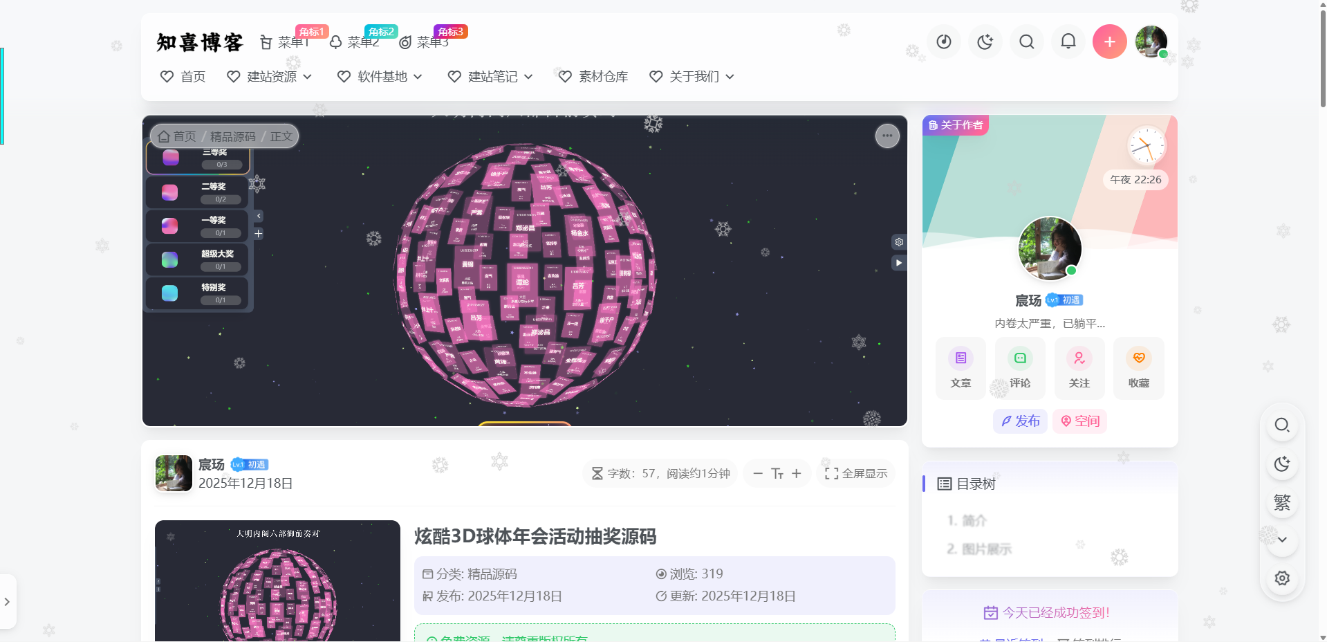 宸玚 2025年12月19日 字数:56,阅读约1分钟 全屏显示 Emlog Pro插件 – 下雪积雪装饰插件 分类: 模板插件 浏览: 84 发布: 2025年12月19日 更新: 2025年12月19日 免费资源,请尊重版权所有。 请先登录 简介 一款emlog的下雪积雪装饰插件,后台可自定义雪花参数,积雪效果需要手动查看主题的样式类名添加到后台 图片展示 EmlogPro 本文作者:宸玚本文链接: https://www.chario.cn/post-59.html 版权声明:本博客所有文章除特别声明外,均默认采用 CC BY-NC-SA 4.0 许可协议。 文章很赞!支持一下吧 还没有人为TA充电 为TA充电 还没有人为TA充电 00Emlog Pro插件 – 下雪积雪装饰插件海报分享QQ分享QQ空间微博分享复制链接 支付宝扫一扫 微信扫一扫 感谢支持 文章很赞!支持一下吧